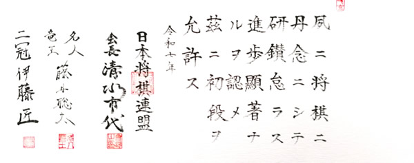 二つ目のタイトルを奪取した伊藤匠二冠の追加署名記念免状を発行いたします。